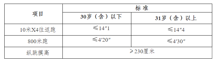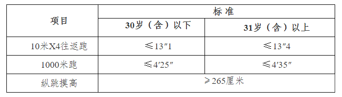 纵跳摸高最多测评次数为3次,其中有1次测评达标的则视为该项目测评合格,三次测评均不达标则该项目测评不合格;10m×4往返跑测评次数最多2次,有1次测评达标的则视为该项目测评合格,两次测评均不达标则该项目测评不合格;男子1000米跑和女子800米跑只有1次测评次数。