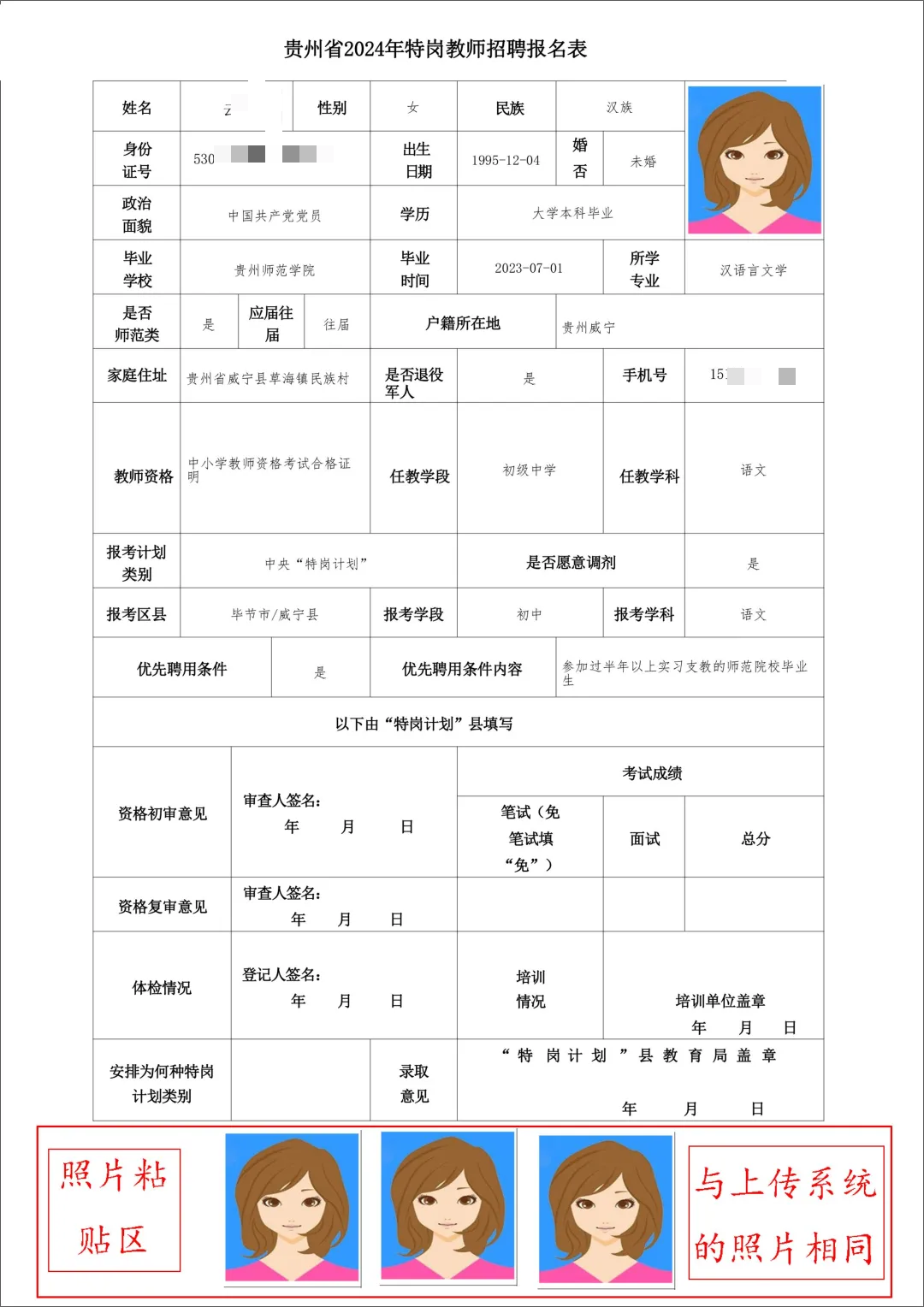 (一)《贵州省2024年农村义务教育阶段学校教师特设岗位计划招聘报名表》(三张1寸蓝底照片并排粘贴在表下方,只涂上半部胶水,照片背面正楷字写上名字和电话,不超出表的下边沿,见样表)。