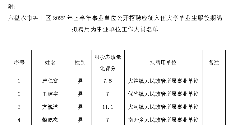 根据《六盘水市大学毕业生参军入伍激励办法(试行)》和《六盘水市2022年上半年事业单位及国有企业公开招聘应征入伍大学毕业生简章》的规定,经征兵报名、事业单位报名、笔试、面试、体格检查、政治考核、签订协议、定兵服役、量化评分、退役选岗、单位考察等工作程序,并报钟山区人民政府常务会议研究决定同意聘用,现将六盘水市钟山区2022年上半年事业单位公开招聘应征入伍大学毕业生服役期满拟聘用为事业单位工作人员名单(名单附后)予以公示,经公示无异议后按规定进行聘用备案。