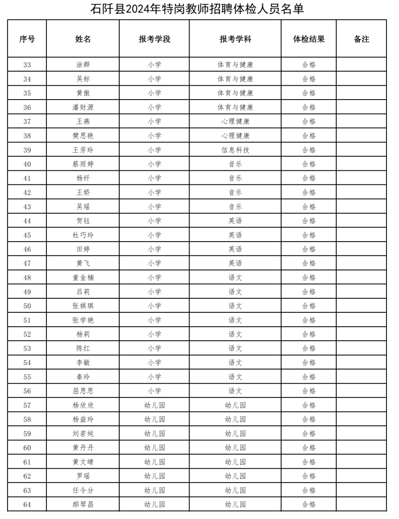 石阡县2024年特岗教师招聘体检结果公示