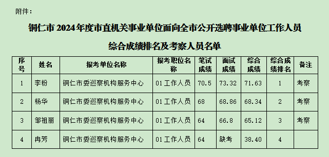 铜仁市2024年度市直机关事业单位面向全市公开遴选公务员、选聘事业单位工作人员综合成绩排名及考察补充公告