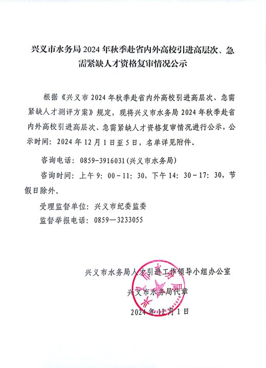 兴义市水务局2024年秋季赴省内外高校引进高层次、急需紧缺人才资格复审情况公示