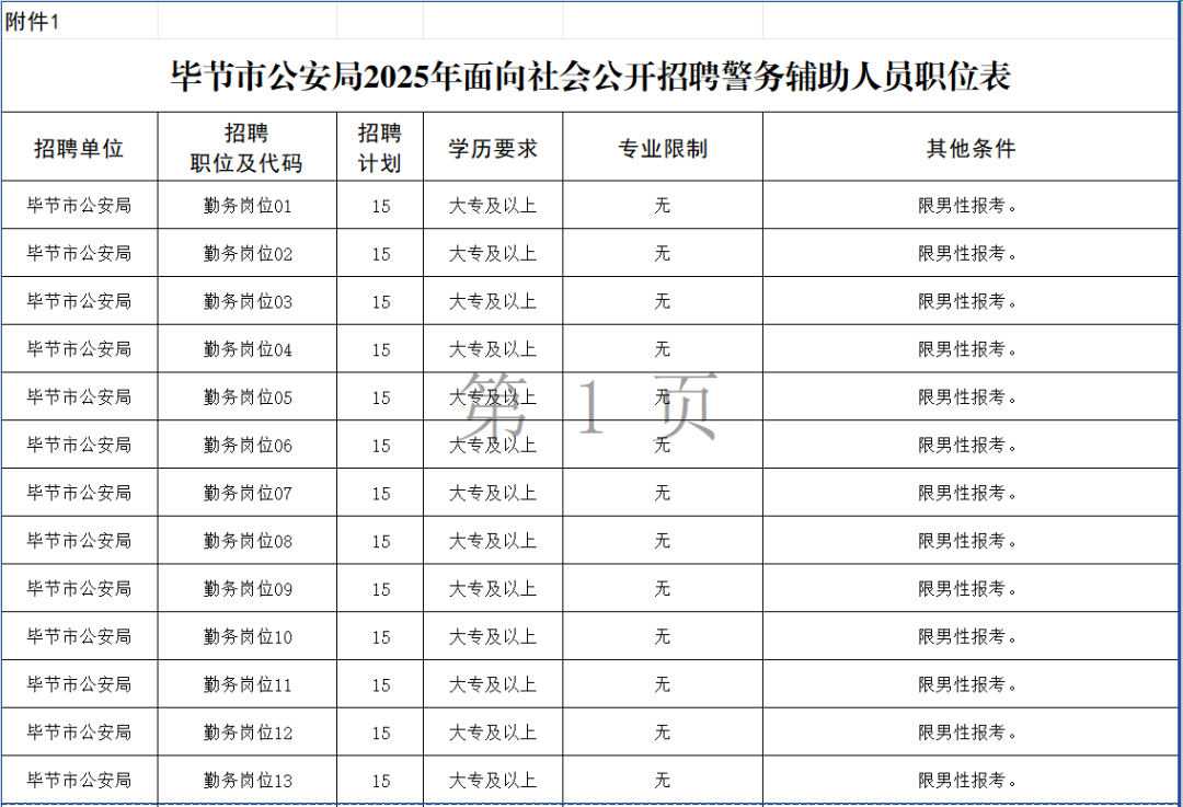 附件1:毕节市公安局2025年面向社会公开招聘警务辅助人员职位表.et