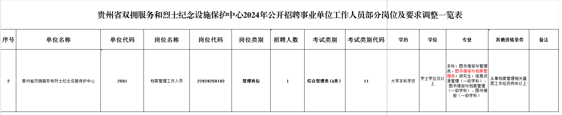 关于调整贵州省双拥服务和烈士纪念设施保护中心2024年公开招聘部分岗位专业条件的公告