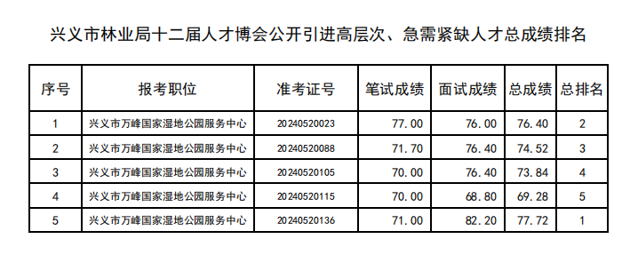 兴义市林业局十二届人才博会公开引进高层次、急需紧缺人才笔试、结构化面试工作已结束,现就笔试、面试2个环节总成绩及排名有关事宜公告如下: