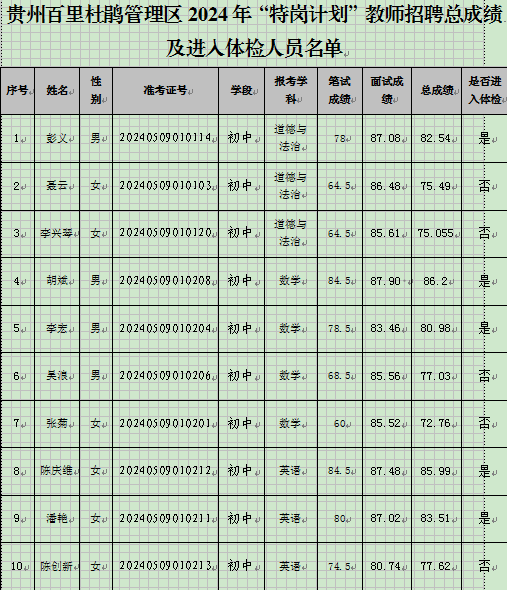 根据《市教育局 市委编办 市财政局 市人力资源和社会保障局关于印发〈毕节市2024年“特岗计划”实施方案〉的通知》《百里杜鹃管理区2024年“特岗计划”教师招聘实施方案》,百里杜鹃管理区2024年“特岗计划”教师招聘面试工作于2024年6月29日顺利完成。现对进入体检人员的总成绩和进入体检人员名单进行公布,并将体检有关事项通知如下。