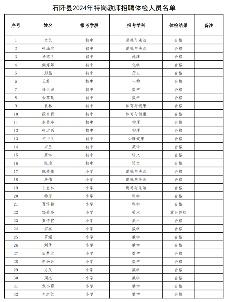 石阡县2024年特岗教师招聘体检结果公示
