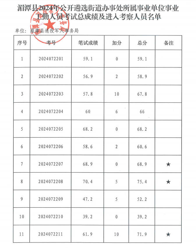 按照《湄潭县2024年公开遴选街道办事处所属事业单位事业工勤人员简章》规定,经报名、资格审查、测试评分,现将总成绩及进入考察人员名单(备注栏为“★”的为进入考察人员)予以公布。
